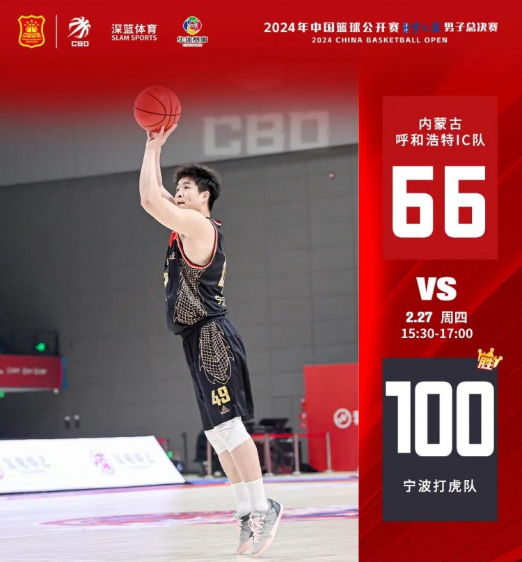 上半場,寧波打虎一開場就展現(xiàn)了超強的得分能力,以16-5領(lǐng)先。內(nèi)蒙古IC通過外線連續(xù)三分,不斷追分。但在快攻的情況下,內(nèi)蒙古IC失誤增多,且命中率下降。半場結(jié)束,寧波打虎50-26領(lǐng)先內(nèi)蒙古IC。下半場,兩隊之間的實力差距愈發(fā)明顯,寧波打虎最終以100-66戰(zhàn)勝內(nèi)蒙古IC。