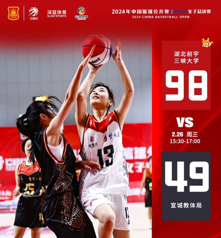 上半場,湖北前宇三峽大學11號劉欣怡、2號張歡分別命中兩分,幫助球隊取得領先。宣城教體局6號張紫涵扳回兩分后,湖北前宇三峽大學在技術和經驗上的優(yōu)勢逐漸顯露,打出一波8-0的得分潮。半場結束,湖北前宇三峽大學53-21領先宣城教體局。易邊再戰(zhàn),宣城教體局雖然頑強拼搏,但年輕小將在實力上和對手還是存在著差距,將分差越拉越大。最終,湖北前宇三峽大學98-49戰(zhàn)勝宣城教體局。