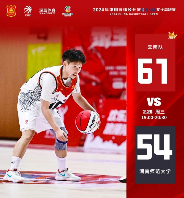 云南隊和湖南師范大學在本輪相遇,實力相當的兩支球隊打得相對膠著。上半場,10平后,湖南師范大學30號趙詩雨兩分命中,隨后6號沈思榆外線再貢獻一個三分球,15-10湖南師范大學超出。云南隊依靠6號羅菲和14號娜漢的進攻緊咬比分。半場結束云南隊落后湖南師范大學1分。下半場,兩隊依舊難解難分。在云南隊幾次外線得分實現反超,14號娜漢外投內突,連續(xù)得分,云南隊士氣大漲,最終云南隊61-54戰(zhàn)勝湖南師范大學。