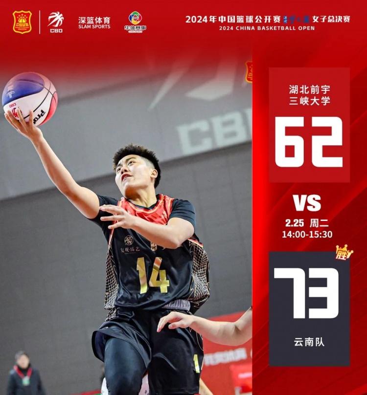 首場(chǎng)比賽由湖北前宇三峽大學(xué)對(duì)陣云南隊(duì),上半場(chǎng)開局,兩隊(duì)打得相對(duì)膠著,比分緊咬至6平。隨后湖北前宇三峽大學(xué)加強(qiáng)防守,8號(hào)漆采籃下強(qiáng)勢(shì),反擊中4號(hào)衛(wèi)香羽、5號(hào)陸婷接連籃下得分,湖北前宇三峽大學(xué)16-9領(lǐng)先。落后的云南隊(duì),不斷通過(guò)外線尋找機(jī)會(huì),14號(hào)娜漢三分命中,幫助球隊(duì)逐漸追平并反超比分。首節(jié)結(jié)束,云南隊(duì)22-20領(lǐng)先湖北前宇三峽大學(xué)。次節(jié),兩隊(duì)進(jìn)攻火力不減,湖北前宇三峽大學(xué)5號(hào)陸婷依舊手感火熱,云南隊(duì)14號(hào)娜漢也不甘示弱。半場(chǎng)結(jié)束,云南隊(duì)39-37領(lǐng)先湖北前宇三峽大學(xué)。下半場(chǎng),隨著體力的下降,兩隊(duì)進(jìn)攻成功率都所有降低,湖北前宇三峽大學(xué)陷入短暫的得分荒,反觀云南隊(duì)在14號(hào)娜漢、6號(hào)羅菲的帶領(lǐng)下,多次反擊快攻得手,最終云南隊(duì)73-62戰(zhàn)勝湖北前宇三峽大學(xué)。
