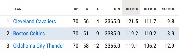 雷霆高居聯(lián)盟第一 防守效率&凈效率聯(lián)盟第一 進攻效率聯(lián)盟第三
