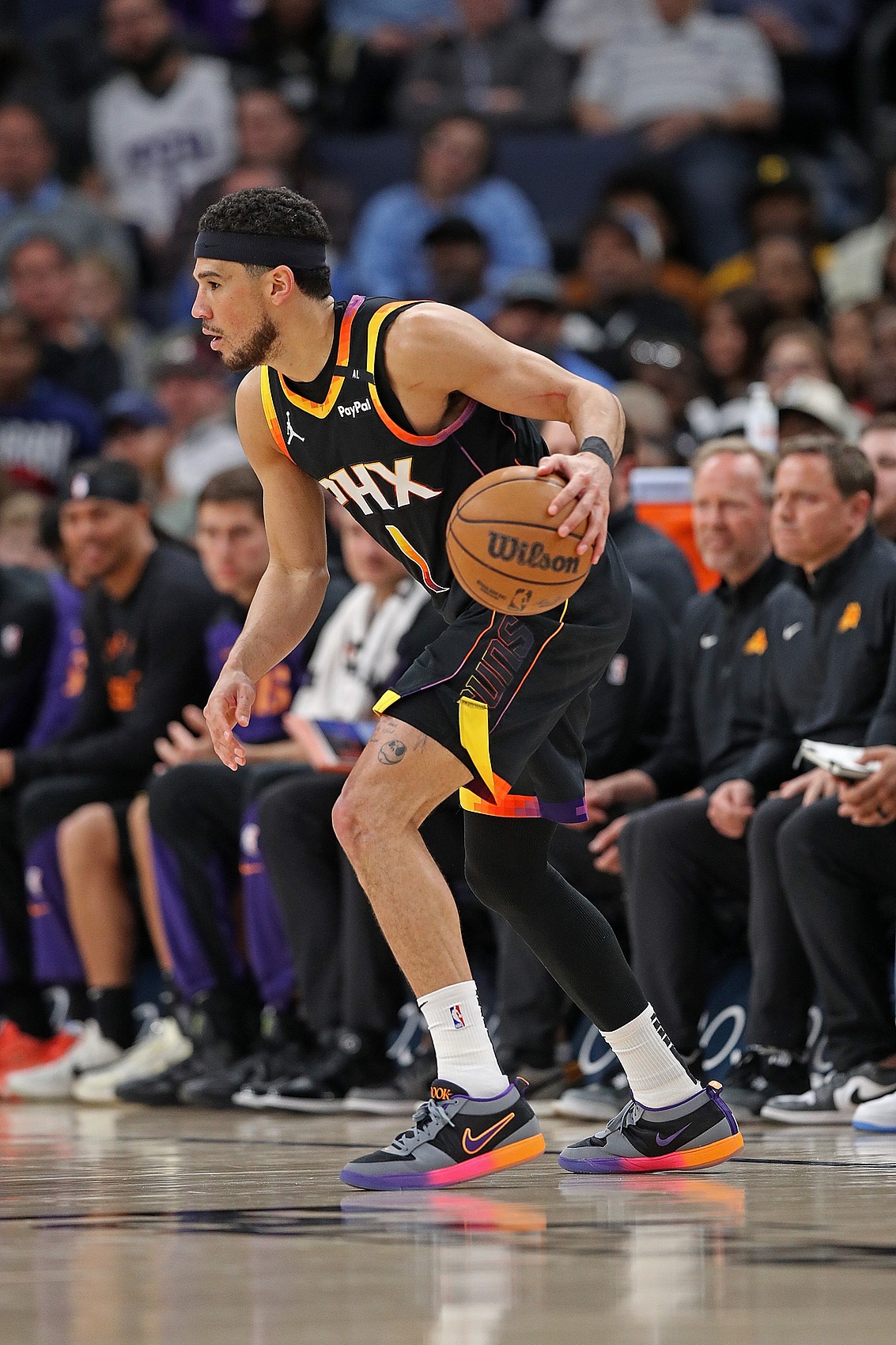 理查茲、比爾、普拉姆利、阿倫四位主要輪換球員缺陣,太陽首發(fā)擺杜蘭特+布克+鄧恩+伊戈達(dá)羅+吉萊斯皮,雖然缺兵少將,但圍繞杜蘭特和布克高位擋拆打阿倫依然成功搶到了開局的先手。