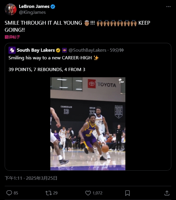 賽后,詹姆斯轉(zhuǎn)發(fā)了布朗尼的賽場(chǎng)集錦并寫(xiě)道:“保持微笑,繼續(xù)前進(jìn),年輕的王子!加油!”