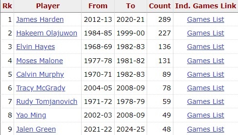 據(jù)統(tǒng)計(jì),這是杰倫-格林生涯第49場比賽30+,追平姚明,并列火箭隊(duì)史第8位。