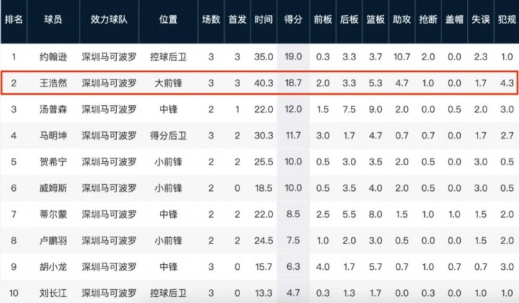 戲份增加的王浩然,產(chǎn)量也無(wú)愧于教練組的信任——他場(chǎng)均18.7分僅次于小外援約翰遜的19分,作為本土隊(duì)內(nèi)得分王的同時(shí),另外也有隊(duì)內(nèi)第4的5.3籃板,和第2的4.7次助攻。