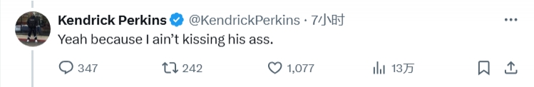 帕金斯隨后還在自己的推特上補(bǔ)充說(shuō):“是的,因?yàn)槲也幌肱乃R屁。”