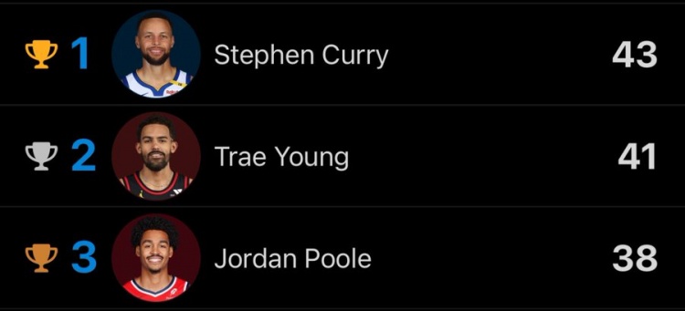 - 本賽季命中30+英尺投籃球員前3名:庫里43記 特雷-楊41 普爾38