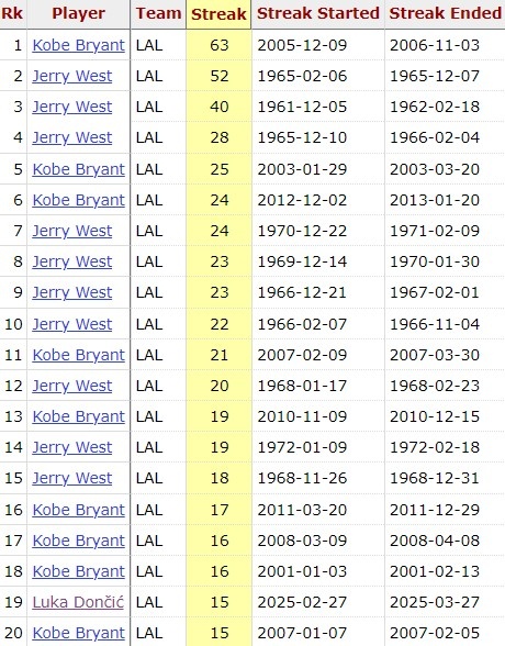 東契奇連續(xù)15場(chǎng)20+ 湖人隊(duì)史后衛(wèi)第3人 比肩科比和韋斯特