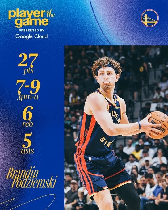 此役勇士后衛(wèi)波杰姆斯基表現非常出色,打了27分鐘14投9中,三分9中7、罰球2中2砍下全場最高27分外加6籃板5助攻1搶斷,正負值+22。