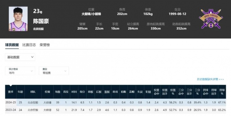 陳國豪今年效率還行,但出場機(jī)會被薩林杰+沈梓捷進(jìn)一步擠壓