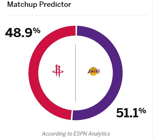 今天,ESPN預(yù)測(cè)本場(chǎng)比賽勝率,湖人51.1%略占優(yōu)勢(shì),火箭(背靠背第二戰(zhàn))48.9%。