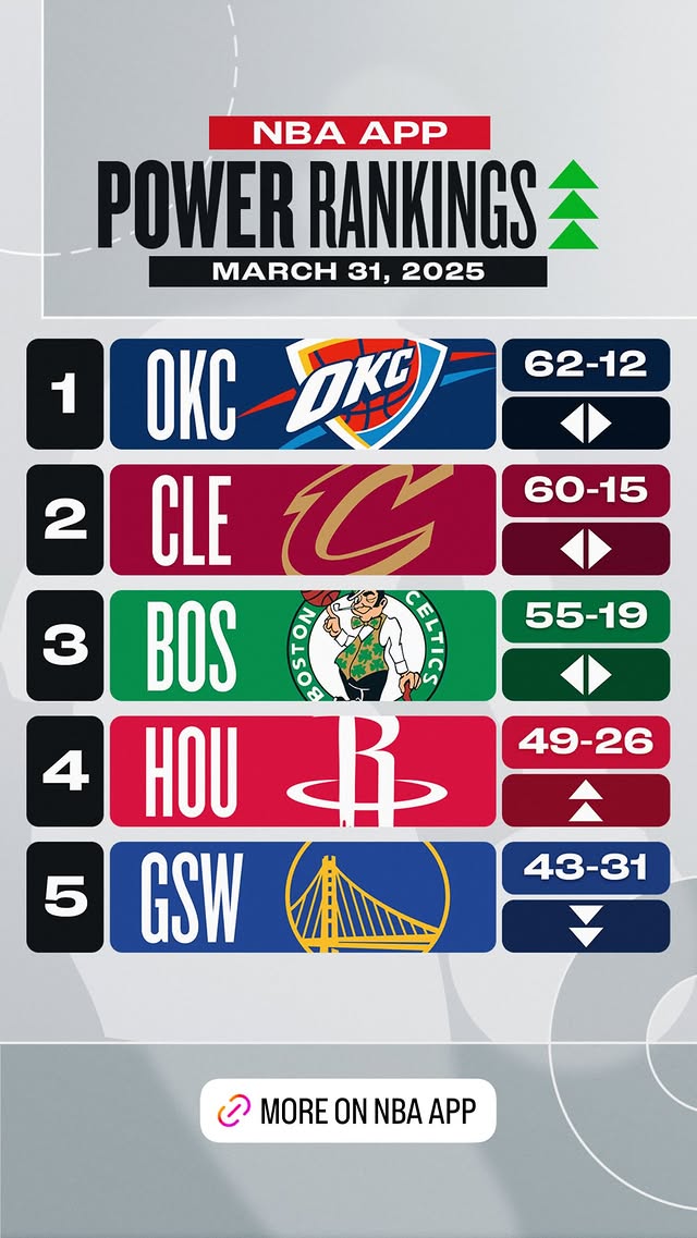 04月01日訊 今日NBA官方更新了最新一期戰(zhàn)力榜。雷霆仍居第一,近13場(chǎng)12勝的火箭狂飆4位升至前四,湖人跌出前五。