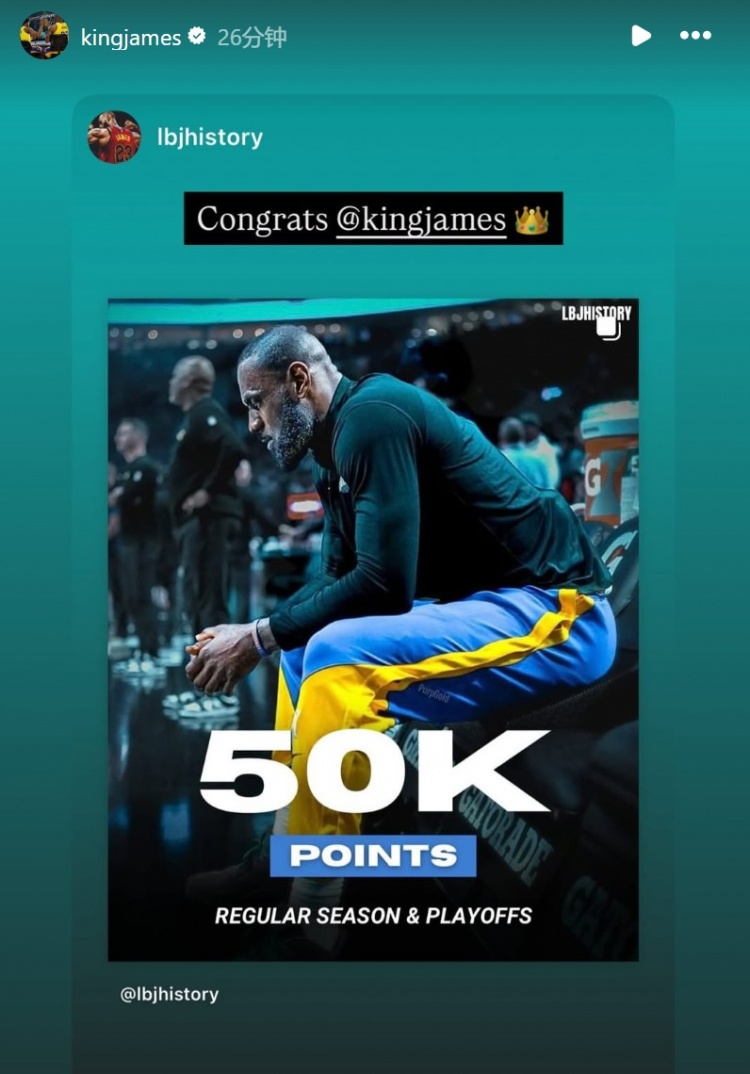 在本場(chǎng)比賽中,詹姆斯生涯總得分突破50000大關(guān);賽后,他轉(zhuǎn)發(fā)了眾多給自己送祝福的動(dòng)態(tài)。