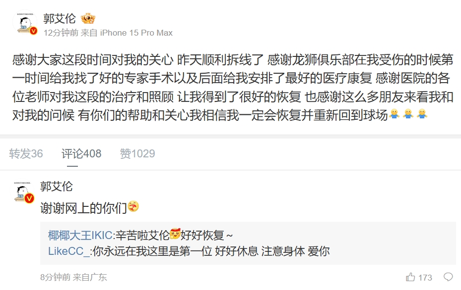 郭艾倫更博報平安:順利拆線了 我一定會恢復(fù)并回到球場!