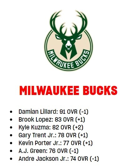 3月7日訊 NBA 2K官網(wǎng)更新了雄鹿球員的能力值情況,利拉德下降,庫(kù)茲馬等多人上調(diào),具體情況如下: