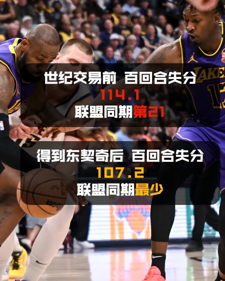 而比起進(jìn)攻端如虎添翼,令人驚訝的是,他們在防守端更是打出了前所未有的質(zhì)量。在一個被質(zhì)疑“防守有巨大問題”的東契奇加入之后,湖人隊反而成為百回合失分同期最少的球隊。他們每百回合足足少丟了6.9分,成為交易日后聯(lián)盟獨(dú)一檔的防守鐵軍。