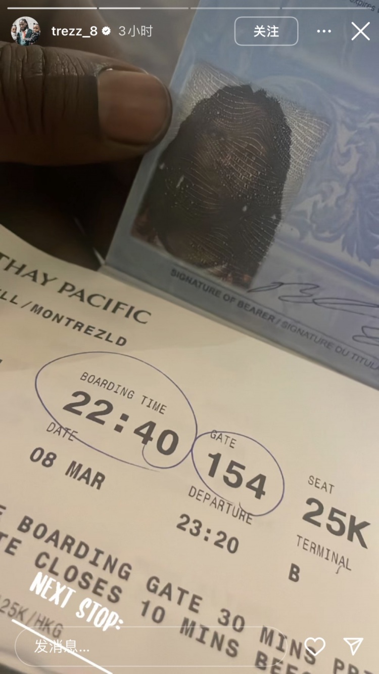 3月9日訊 哈雷爾今天更新社媒,曬出了自己的機票以及準備登機的圖片。