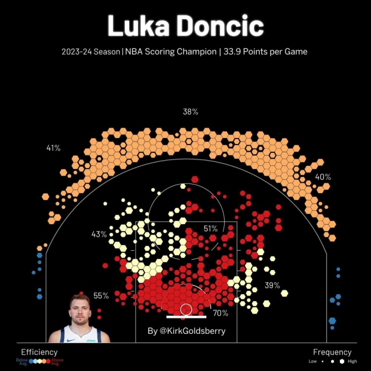 如果說有一個重大成就推動了東契奇成為得分王,那就是他在遠距離投籃方面的進步。去年,東契奇在三分球出手次數(shù)和三分球命中率方面都創(chuàng)下了職業(yè)生涯新高,744次三分球出手,命中率為38.2%。