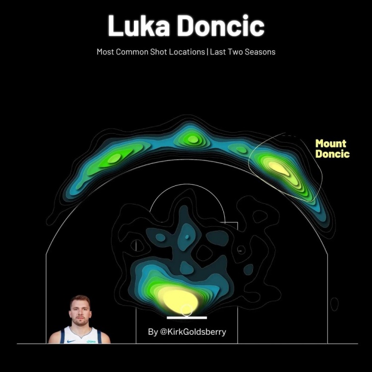 當你繪制出東契奇最常見的投籃位置時,有兩個熱點:一個在籃筐附近,另一個是在三分線外左側(cè)45度處。這個外線熱點正是東契奇在周日的比賽中讓布勞恩上當?shù)牡胤健@也是東契奇最喜歡的起舞的位置。