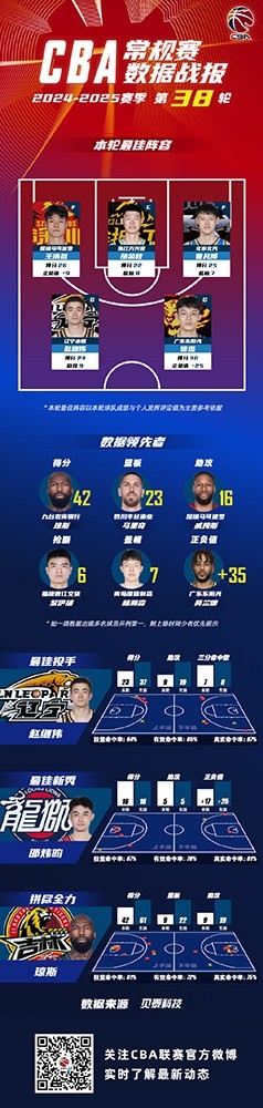 2024-2025賽季CBA聯(lián)賽常規(guī)賽第38輪結(jié)束較量,來自深圳新世紀(jì)烈豹籃球俱樂部的王浩然,浙江廣廈籃球俱樂部的胡金秋,北京首鋼籃球俱樂部的曾凡博,遼寧沈陽三生飛豹籃球俱樂部的趙繼偉和廣東宏遠籃球俱樂部的徐杰入選CBA聯(lián)賽常規(guī)賽第38輪最佳陣容!