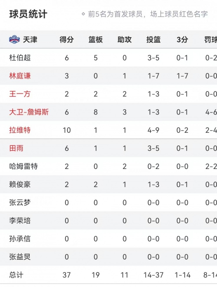 全隊(duì)都一樣鐵!天津半場(chǎng)三分球14中1 其中林庭謙三分7中1