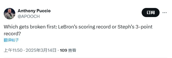 對(duì)此,記者Anthony Puccio發(fā)推問(wèn)道:“詹姆斯的得分紀(jì)錄和庫(kù)里的三分紀(jì)錄,哪個(gè)會(huì)先被打破?”