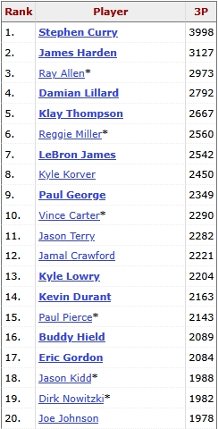 庫(kù)里達(dá)成4000記三分堪稱劃時(shí)代的成就,縱觀現(xiàn)役球員,僅少數(shù)幾位具備沖擊這一里程碑的理論可能性:
