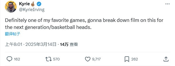 美媒寫道:“5年前的今天(2020年1月31日),歐文31分鐘砍下54分,僅投丟了4個(gè)球?!睔W文則回復(fù)道:“這絕對是我最喜歡的比賽之一,我會為下一代(球員)/球迷們解析這場比賽。”