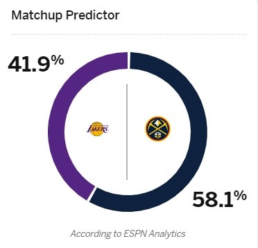 ESPN預(yù)測了本場比賽兩隊的勝率,其中湖人41.9%,掘金58.1%!