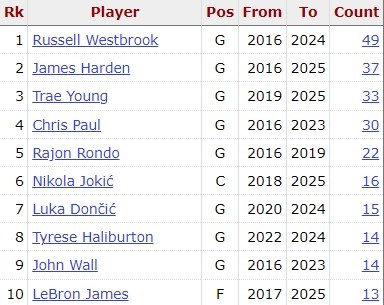 威少過去10個(gè)賽季50次半場助攻上雙 同期最多 哈登37次第二