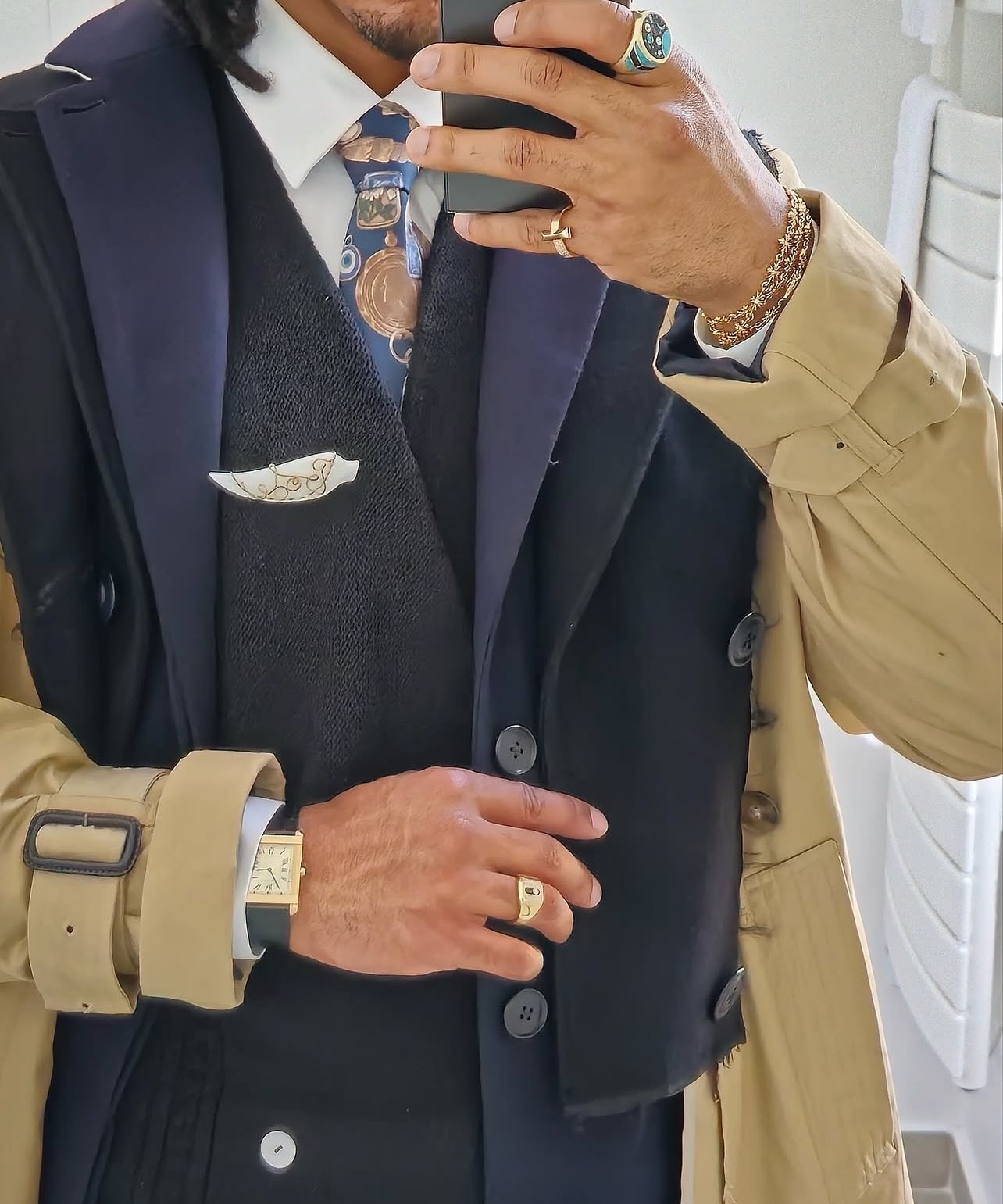 這一次孔德的穿搭中,最引人注目的就是他身上的拼接外套,這件大衣來自日本小眾設計師品牌FACETASM,是2022-23的秋冬系列中的一件。