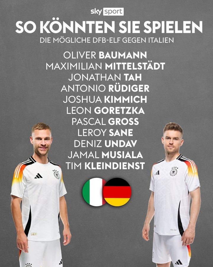 德天空預(yù)測德國隊首發(fā)如下:鮑曼、米特爾施塔特、若納坦-塔、呂迪格、基米希、格雷茨卡、格羅斯、薩內(nèi)、翁達夫、穆西亞拉、克萊因丁斯特