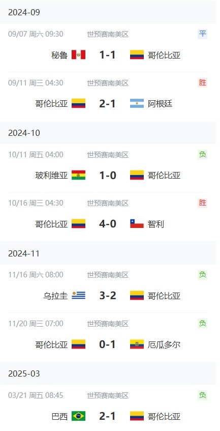 哥倫比亞在世預賽已經(jīng)遭遇3連敗,而在其美洲杯決賽不敵阿根廷之后,球隊在近7場比賽只取得2勝1平4負。具體戰(zhàn)績?nèi)缦拢?/p>