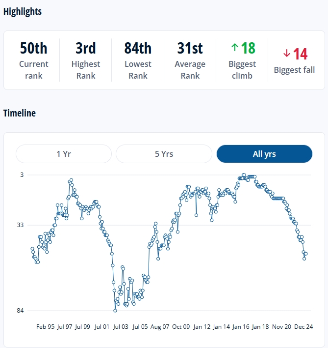 智利的FIFA排名曾在2016年達(dá)到隊(duì)史最高的第3名,從2021年開始,智利的排名就不斷下降,最低跌至過第53名,如今為第50名。