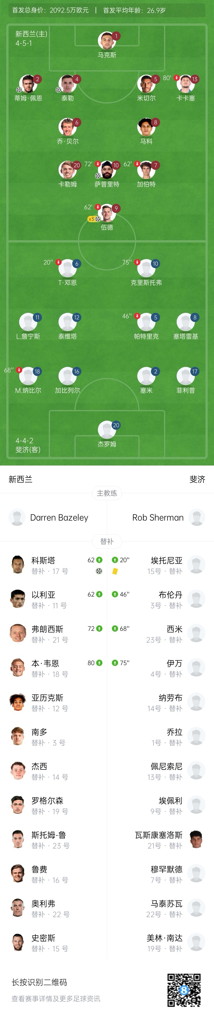 新西蘭目前FIFA排名第89名,比中國隊高一名(中國FIFA第90),新西蘭陣中頭號前鋒是效力于諾丁漢森林的伍德,身價1000萬歐。