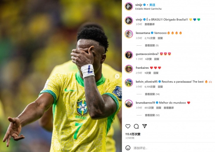 維尼修斯也在賽后通過社媒曬出自己的慶祝照,并配文:“這就是巴西!??!感謝巴西利亞?。?!”
