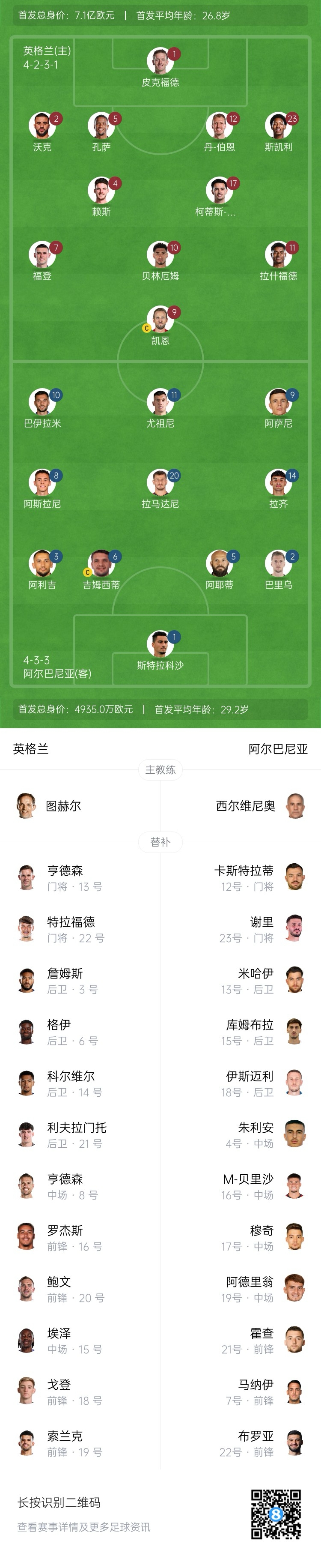 英格蘭vs阿爾巴尼亞首發(fā):凱恩、貝林、拉什福德先發(fā)、斯凱利首秀