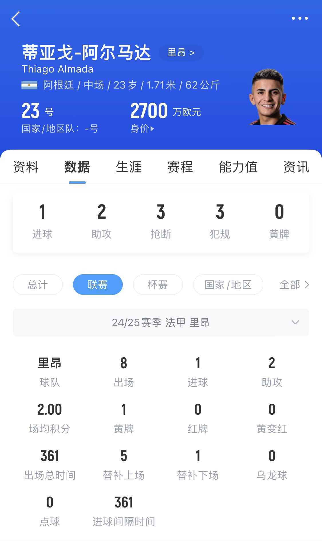 23歲的阿爾馬達今年租借里昂,3月16日剛收獲法甲首球,近兩場法甲1球2助,球員目前身價為2700萬歐。