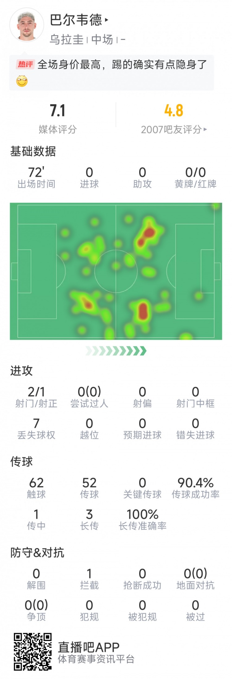 存在感不強(qiáng),巴爾韋德本場(chǎng)數(shù)據(jù):2射1正,對(duì)抗&搶斷等數(shù)據(jù)掛零