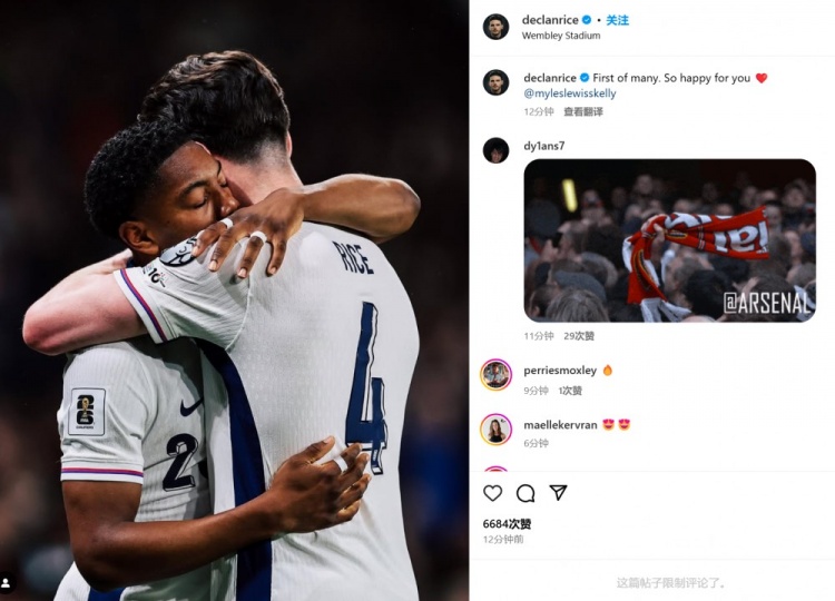 作為雙料隊(duì)友的老大哥賴斯也在賽后通過(guò)社媒曬出兩人的擁抱照,并配文:“未來(lái)眾多進(jìn)球里的第一個(gè)!我為你感到非常開(kāi)心??@斯凱利”。