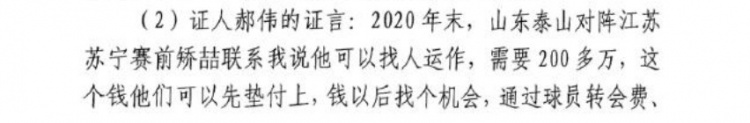 2020年末,山東泰山對陣江蘇蘇寧賽前矯喆聯(lián)系我說他可以找人運作,需要200多萬,這個錢他們可以先墊付上,錢以后找個機會,通過球員轉(zhuǎn)會費、簽字費把錢賺回來,我同意了,矯喆就去做江蘇球員“工作”,加上我這邊讓球員全力以赴去踢,最終這場比賽的比分是山東泰山隊2-0江蘇蘇寧,我們(足協(xié)杯)奪冠了。矯喆和我說他們運作這場球花了200萬,這個錢是矯喆他們出的。我沒有主動還過這個錢,但是我把矯喆招到我們隊當(dāng)助理教練了,給他找了個工作,也算是還他幫我的運作這場比賽的人情了。