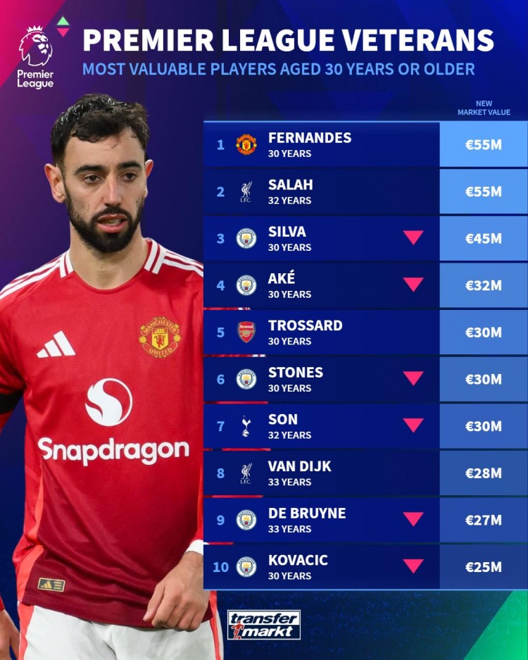 英超年齡30+球員身價(jià)榜:B費(fèi)、薩拉赫5500萬歐居首,B席第三