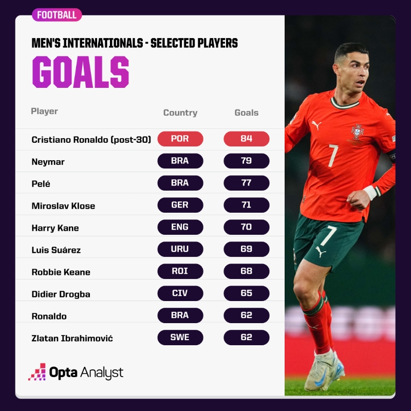 越老越妖!30歲后C羅國(guó)家隊(duì)84球 超內(nèi)馬爾等眾星國(guó)家隊(duì)進(jìn)球數(shù)