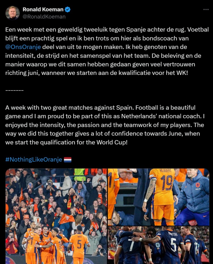 3月25日訊 荷蘭在歐國聯(lián)八強戰(zhàn)經(jīng)歷點球大戰(zhàn)不敵西班牙,主帥科曼在今日通過社媒發(fā)文。