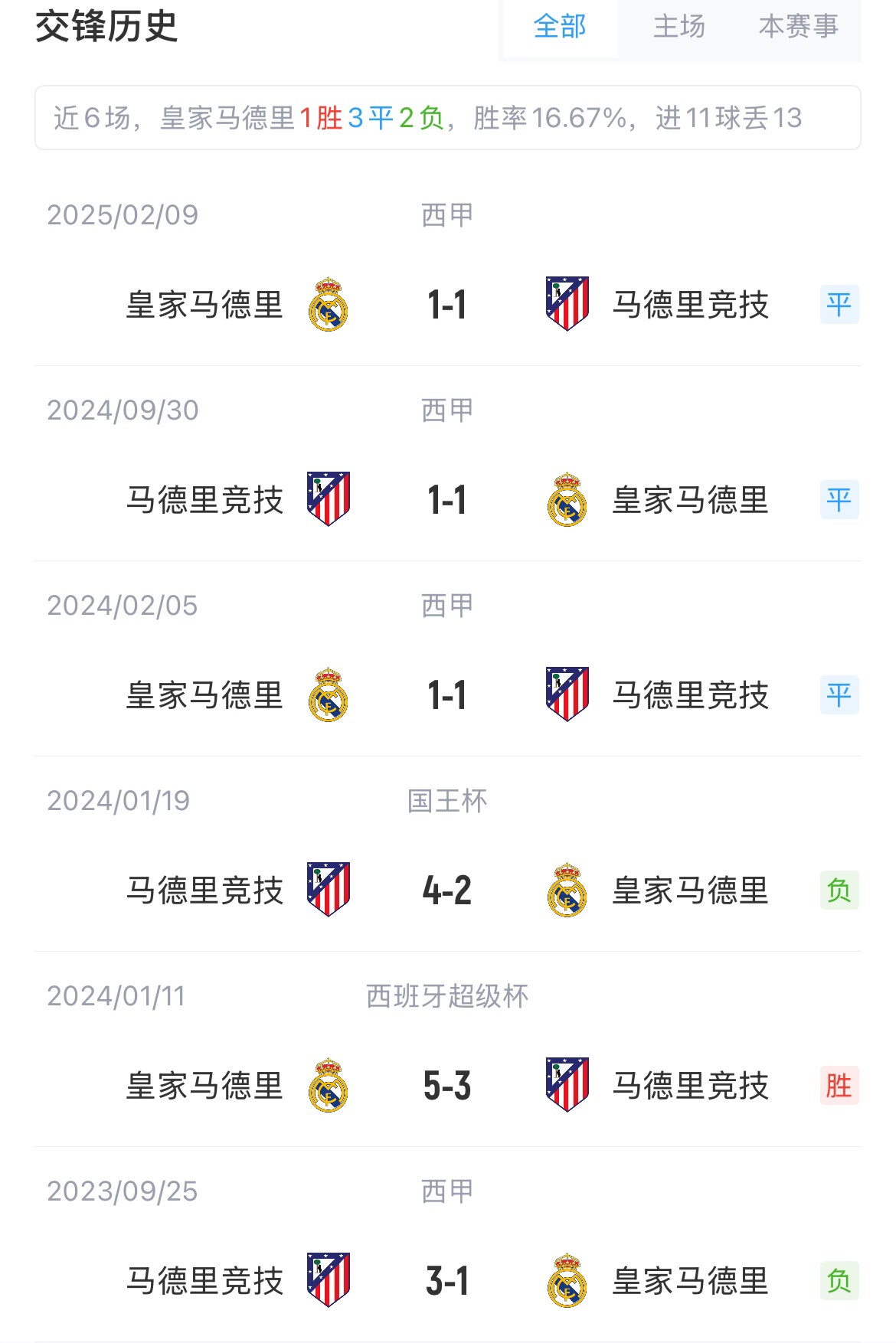 皇馬與馬競在歐戰(zhàn)共交手10次,皇馬5勝2平3負,其中兩次在歐冠決賽戰(zhàn)勝馬競。本賽季,兩隊在西甲的兩次對決均戰(zhàn)成1-1。