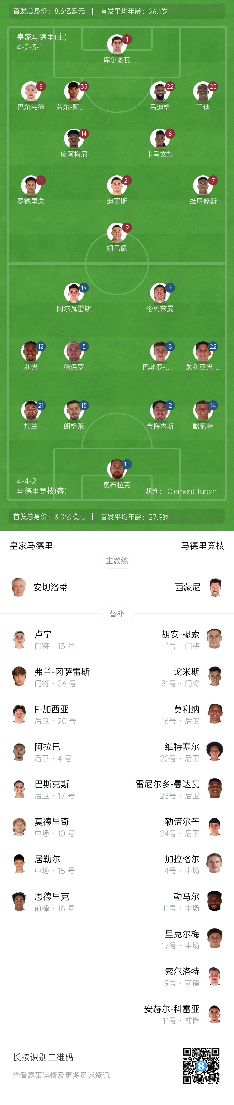 皇馬首發(fā):1-庫爾圖瓦、8-巴爾韋德、35-勞爾-阿森西奧、22-呂迪格、23-費蘭-門迪、14-瓊阿梅尼、6-卡馬文加、11-羅德里戈、21-迪亞斯、7-維尼修斯、9-姆巴佩