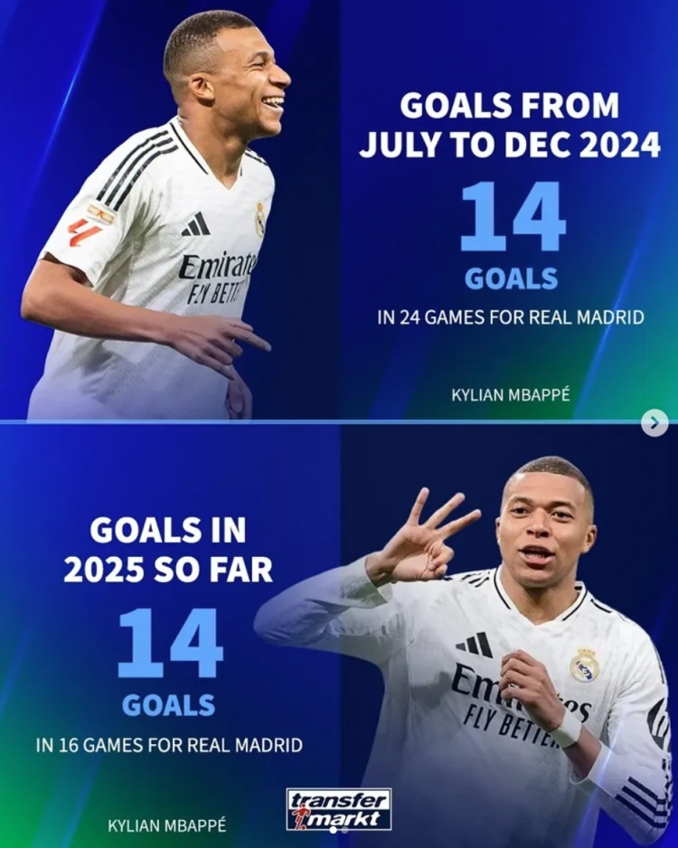 作為對比,姆巴佩在去年7月到12月共計(jì)24場打進(jìn)14球,而進(jìn)入2025年后16場也打進(jìn)14球。