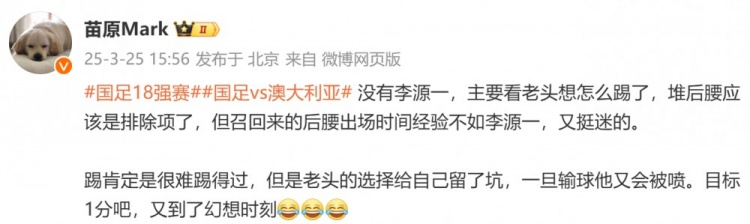 3月25日訊 國足今晚將在世預(yù)賽杭州主場對陣澳大利亞,媒體人苗原發(fā)文談到對國足陣容的看法。