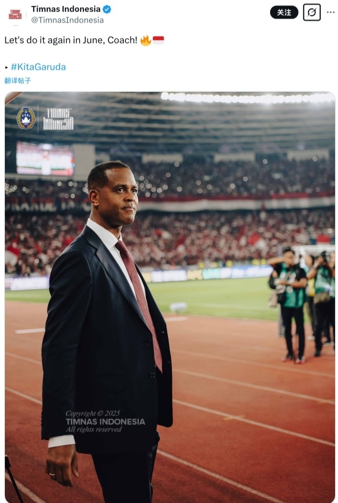 印尼國家隊官推今日更新社媒,曬出克魯伊維特在場邊執(zhí)教的照片,并配文寫道:“讓我們6月份再來一次,教練!”