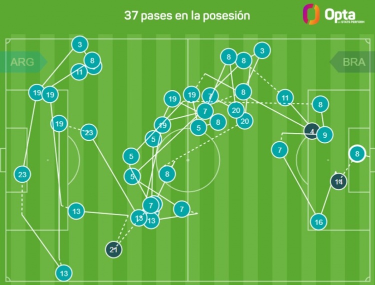 恩佐-費(fèi)爾南德斯攻入阿根廷本場比賽的第二粒進(jìn)球,據(jù)Opta統(tǒng)計(jì),這粒進(jìn)球經(jīng)過37腳連續(xù)傳球,這是本屆南美世預(yù)賽連續(xù)傳球次數(shù)第二多的進(jìn)球。